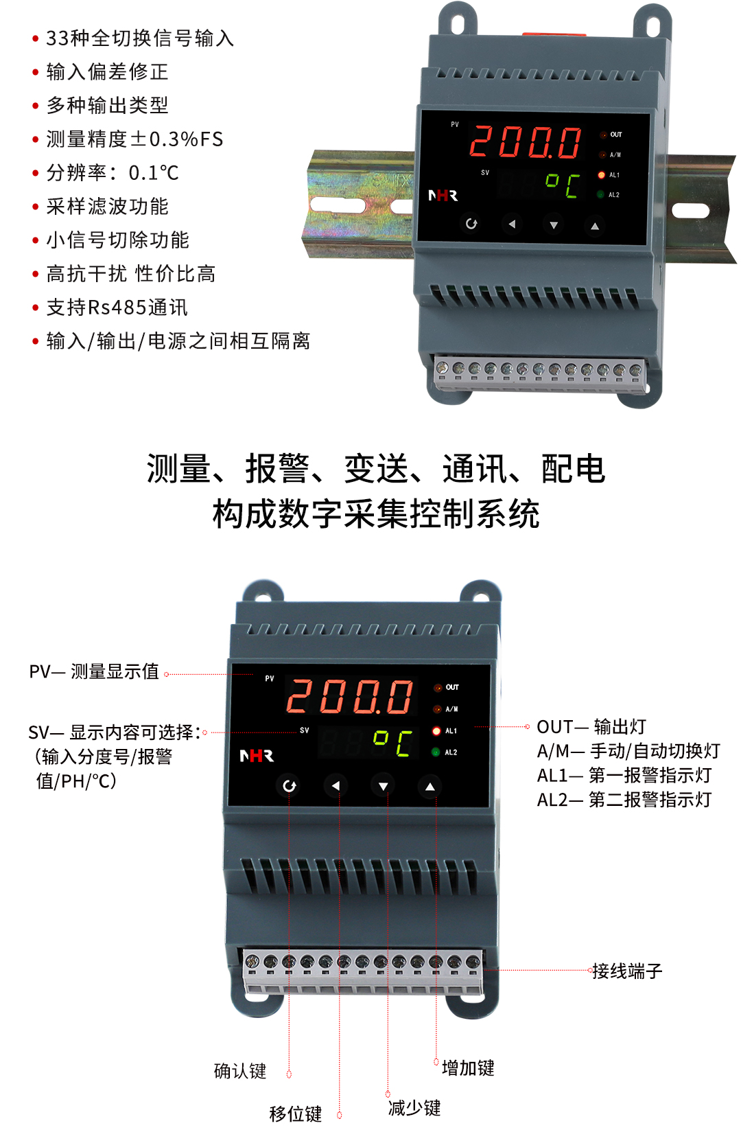 虹潤公司是專業(yè)生產(chǎn)數(shù)顯表的國家專精特新“小巨人”企業(yè),生產(chǎn)的導軌式數(shù)顯儀表,具有全切換信號輸入,導軌壁掛共用,全隔離設計,高抗干擾,變送輸出或RS485通訊等特點。產(chǎn)品獲得巡回檢測顯示方法及裝置、工業(yè)模塊的導軌式安裝結(jié)構(gòu)等2項國家發(fā)明專利,主持起草工業(yè)過程控制系統(tǒng)用模擬輸入兩位或多位輸出儀表、物聯(lián)網(wǎng)智能溫度儀表通用技術條件等2項國家標準,,以及通信系統(tǒng)多通道數(shù)據(jù)采集控制終端規(guī)范軍用標準,參與國際5G標準制定,取得簡易數(shù)顯儀表等3項相關軟件著作權(quán)。產(chǎn)品廣泛應用于電力、石化、冶金、化工、造紙、食品、輕工、制藥、熱處理、水處理、機械配套等各種工業(yè)現(xiàn)場。