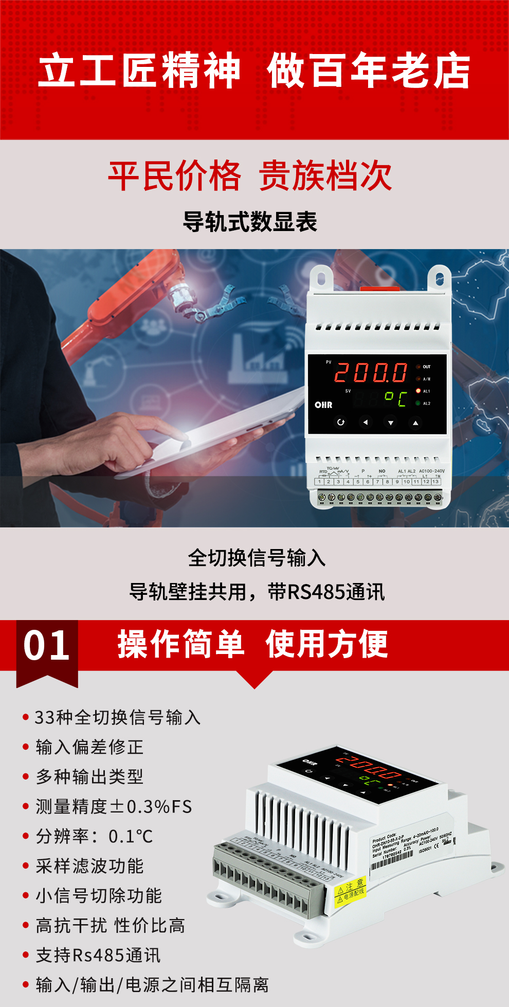 虹潤(rùn)公司是專業(yè)生產(chǎn)數(shù)顯表的國(guó)家專精特新“小巨人”企業(yè),生產(chǎn)的導(dǎo)軌式數(shù)顯儀表,具有全切換信號(hào)輸入,導(dǎo)軌壁掛共用,全隔離設(shè)計(jì),高抗干擾,變送輸出或RS485通訊等特點(diǎn)。產(chǎn)品獲得巡回檢測(cè)顯示方法及裝置、工業(yè)模塊的導(dǎo)軌式安裝結(jié)構(gòu)等2項(xiàng)國(guó)家發(fā)明專利,主持起草工業(yè)過程控制系統(tǒng)用模擬輸入兩位或多位輸出儀表、物聯(lián)網(wǎng)智能溫度儀表通用技術(shù)條件等2項(xiàng)國(guó)家標(biāo)準(zhǔn),,以及通信系統(tǒng)多通道數(shù)據(jù)采集控制終端規(guī)范軍用標(biāo)準(zhǔn),參與國(guó)際5G標(biāo)準(zhǔn)制定,取得簡(jiǎn)易數(shù)顯儀表等3項(xiàng)相關(guān)軟件著作權(quán)。產(chǎn)品廣泛應(yīng)用于電力、石化、冶金、化工、造紙、食品、輕工、制藥、熱處理、水處理、機(jī)械配套等各種工業(yè)現(xiàn)場(chǎng)。