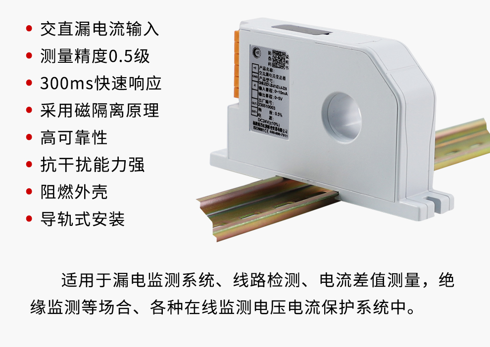 OHR-ES30系列交流/直流漏電流變送器對電網(wǎng)和電路中的交直流電流信號進行實時測量,具有高精度、高隔離、 低漂移、低功耗、體積小、響應(yīng)快、抗干擾能力強等特點。本產(chǎn)品采用標(biāo)準(zhǔn)DIN35mm導(dǎo)軌安裝,端子接線,安裝方 便,適用于測量漏電監(jiān)測系統(tǒng),線路檢測,電流差值測量,絕緣監(jiān)測等場合。
