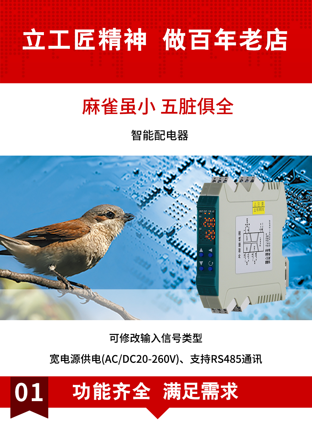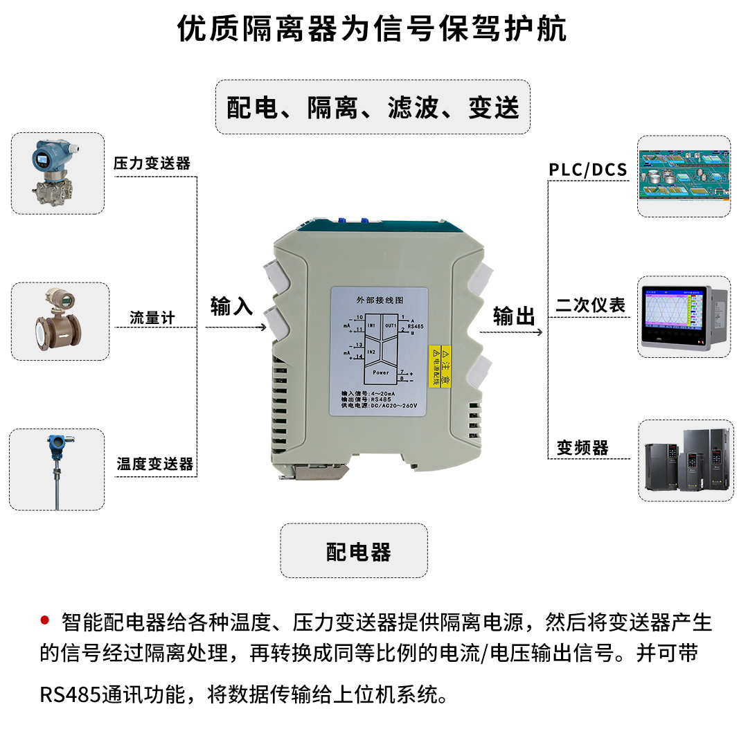 虹潤公司是專業(yè)生產(chǎn)隔離器的國家專精特新“小巨人”企業(yè)。生產(chǎn)的導(dǎo)軌式智能配電器,具有配接二三線制變送器,輸入輸出電源三隔離,響應(yīng)時(shí)間快,傳輸精度0.1%FS,支持485通訊輸出等特點(diǎn)。產(chǎn)品獲得信號(hào)隔離器、一種二端子模塊、無源信號(hào)隔離器等3項(xiàng)國家發(fā)明專利,主持起草現(xiàn)場設(shè)備工具(FDT)接口規(guī)范、工業(yè)過程測量和控制系統(tǒng)用隔離式安全柵、工業(yè)過程測量和控制系統(tǒng)用配電器等3項(xiàng)國家標(biāo)準(zhǔn),以及通信系統(tǒng)多通道數(shù)據(jù)采集控制終端規(guī)范軍用標(biāo)準(zhǔn)。參與國際5G標(biāo)準(zhǔn)制定。,取得智能隔離器等2項(xiàng)相關(guān)軟件著作權(quán)。產(chǎn)品廣泛應(yīng)用于石油、化工,冶金、電力、食品、光伏能源、污水處理等需要電隔離的工業(yè)自動(dòng)化控制系統(tǒng)。