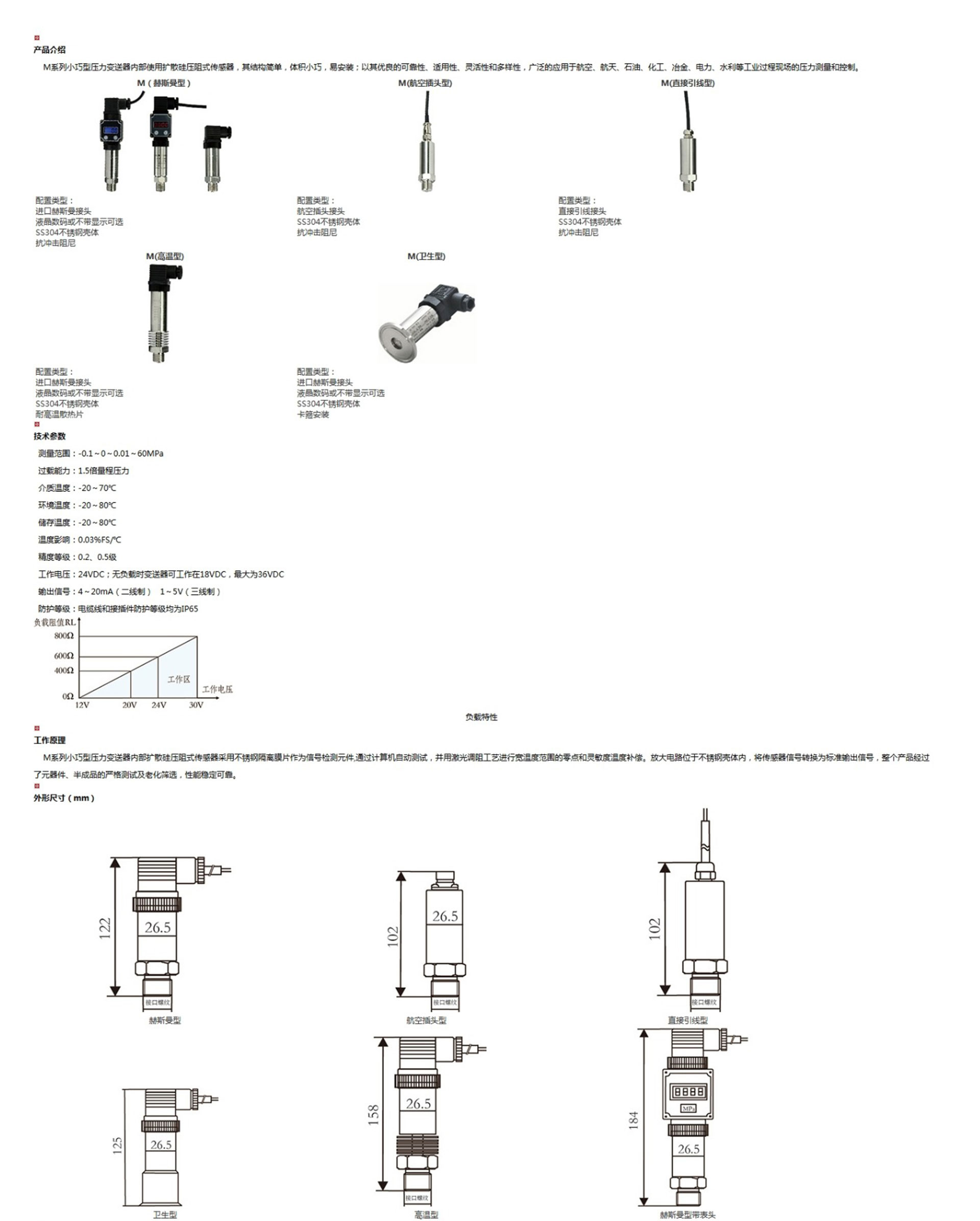 M系列小巧型壓力變送器內(nèi)部使用擴散硅壓阻式傳感器,其結(jié)構(gòu)簡單,體積小巧,易安裝;以其優(yōu)良的可靠性、適用性、靈活性和多樣性,廣泛的應用于航空、航天、石油、化工、冶金、電力、水利等工業(yè)過程現(xiàn)場的壓力測量和控制。